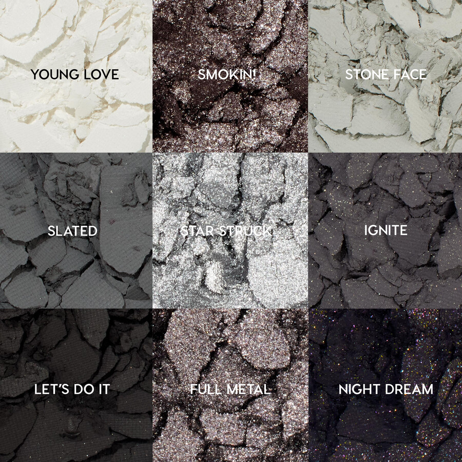 Esta paleta en escala de grises es el sueño de cualquier amante del glamuroso ahumado. Con 3 tonos metálicos brillantes y 6 sombras mate difuminables, crea los ahumados más fáciles de la historia. Con nuestra fórmula de polvos compactos ultrapigmentados de larga duración, se aplica de manera uniforme y se difumina de maravilla.